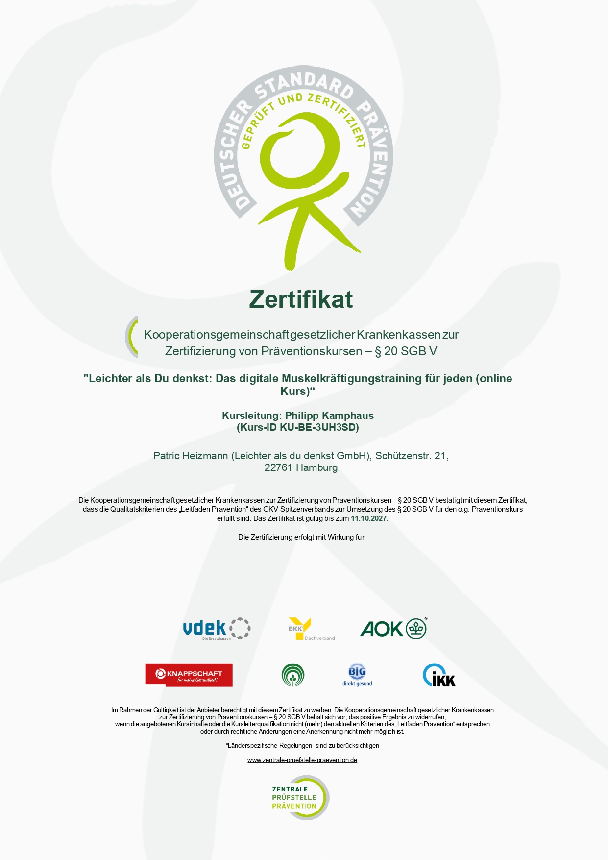 Für die Ausarbeitung der Projektunterlagen und für die Absprachen zur Förderung mit den Krankenkassen wurde Philipp Kamphaus als Unterstützung hinzugezogen. Philipp ist studierter Fitnessökonom und Experte für digitale Präventionskurse.